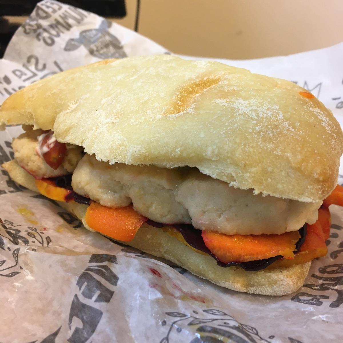 Muy rico sándwich. Tiene pan de masa madre, calabaza grillada, zanahoria glaseada, tomate confitado, chips de remolacha, queso y veganesa.