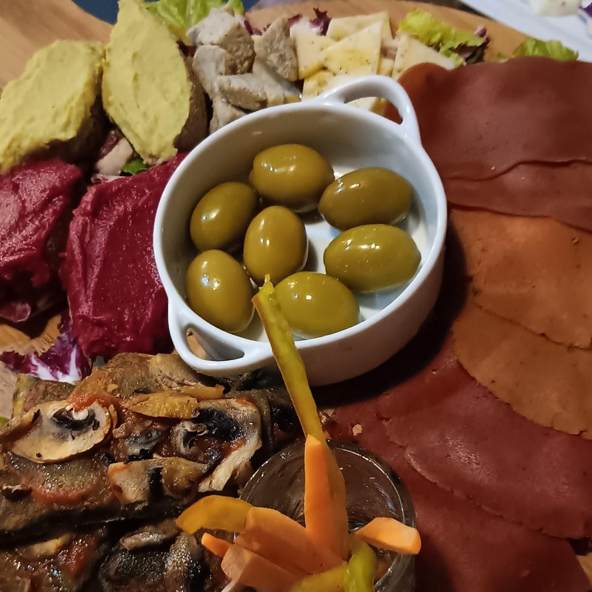 Formaggi stagionati vegetali e affettati molto buoniLe olive sono olive XDPinsa con pomodoro e funghi Bruschettine di humus di ceci e barbabietole promosse