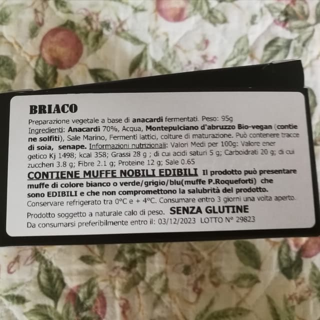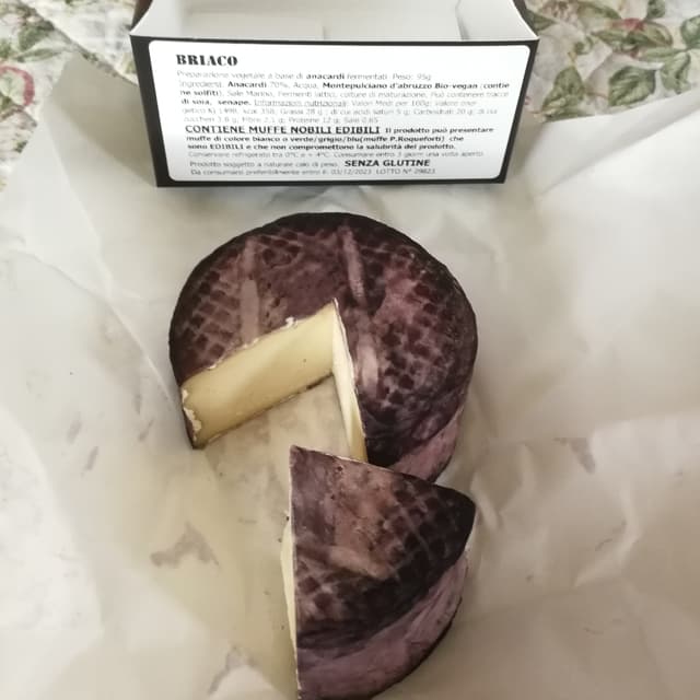Briaco is a fermented cashew-based cheese that has been infused with organic Montepulciano d'Abruzzo and edible molds. This handcrafted cheese offers a unique taste that is similar to traditional cheese, with a wine back-taste that is particularly appealing to vegans who enjoy the flavor of Camembert. The external color of the cheese is also noteworthy, making it a visually appealing addition to any vegan cheese board. Overall, Briaco is a tasty and vegan-friendly cheese option that is well worth trying.