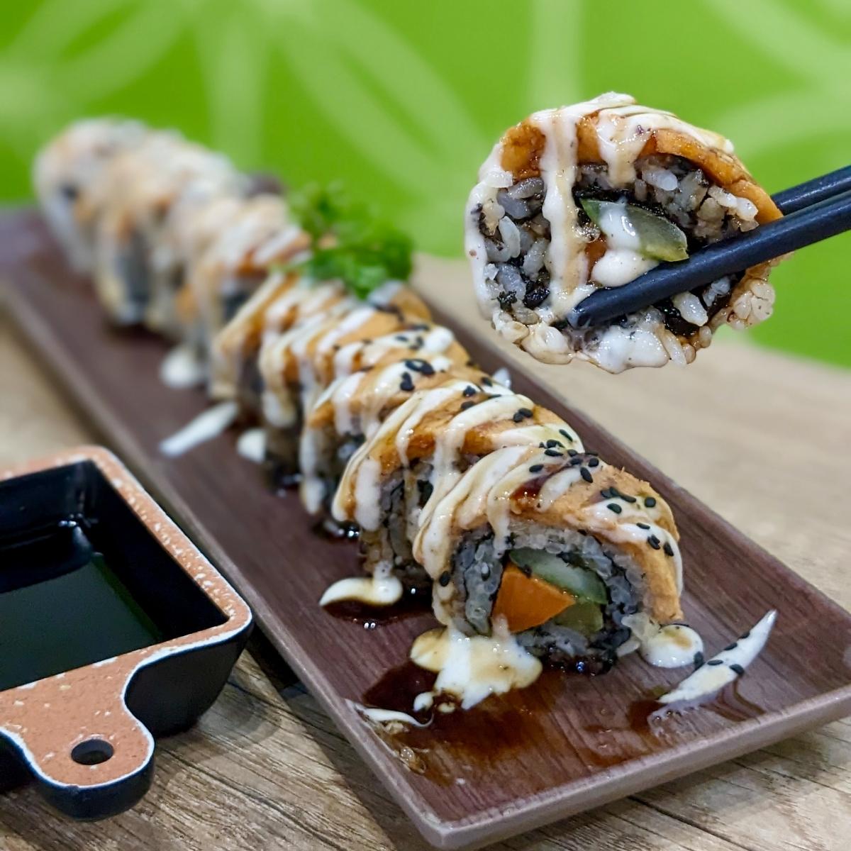 Korean-inspired seaweed rice roll filled with carrot, cucumber, and yellow pickled radish 🍙🥕🥒 further topped with a thick slab of textured soy protein 'ham' / 'spam' and heavily doused in vegan mayonnaise with sesame seeds. Think it would have been cute to add in some turmeric tofu or OnlyEg 'gyeran mari rolled omelette' to resemble traditional kimbab more closely! 🍳 Personally didn't find the soy sauce dip necessary, as the dish was already quite savoury and flavourful on its own. Fun side to share and actually also sufficiently filling / nutritionally balanced as one person's main. (Allium-free, $11.50) #sgvegan #korean