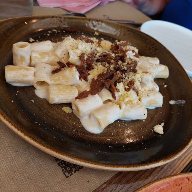 Un piatto di pasta abbondante, super cremoso, cottura perfetta e con (credo) seitan croccante. Fantastico!