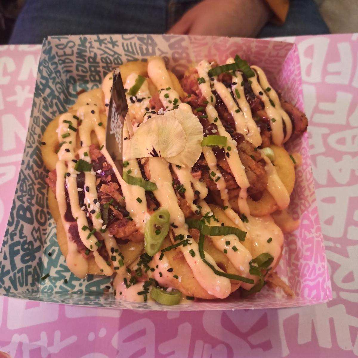Patatine fritte a forma di smile accompagnate da carne vegetale e salsine. Buono!