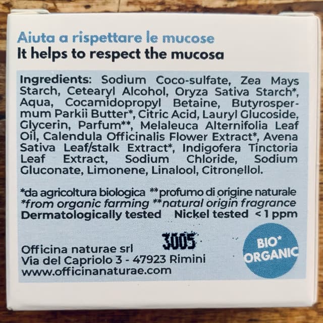 Detergente intimo solido di cui ho preso la taglia piccina così da provarlo senza impegno (adoro le aziende che danno questa possibilità!). Non ha profumo e crea rapidamente una leggera schiuma che permette di detergersi. Ovviamente la confezione è in carta e basta tenerla bene per poterci conservare il prodotto durante l’uso. Consigliato!