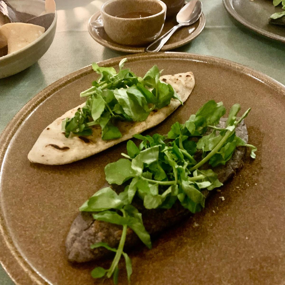 En el restaurante Cordelia que se encuentra dentro de la Posada del Tepozteco podrás encontrar estos tlacoyos, uno era de haba y el otro de frijol, decorados con quelites. Van servidos sobre pipián verde pero no es vegano así que les pedí que no se lo pusieran.