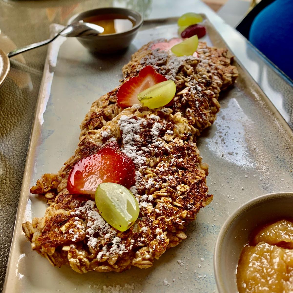 Y la otra opción de desayuno que tienen son estos pancakes veganos que más bien son como tortitas de avena, están súper ricas, les pusieron canela y azúcar glass, uvas, fresas y las acompañan con miel de agave y mermelada de ciruela hecha en casa que está deliciosa, aprovechan muy bien la fruta ya que está lleno de ciruelos por todo el lugar. Súper recomendables 😁😋 #veganisnotscary #veganbreakfast #veganpancakes #govegan