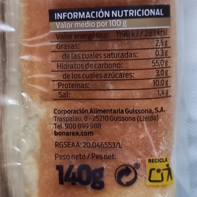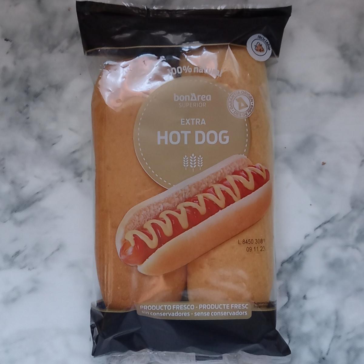Pan hot dog extra. Ingredientes: harina de trigo, agua, aceite de girasol, levadura, azúcar, extracto de masa madre, harina de trigo fermentada, gluten de trigo, almidón de trigo y sal. Producto 100% natural. No proviene de masas congeladas. Envase en bolsa de plástico. 2 unidades. 140g.