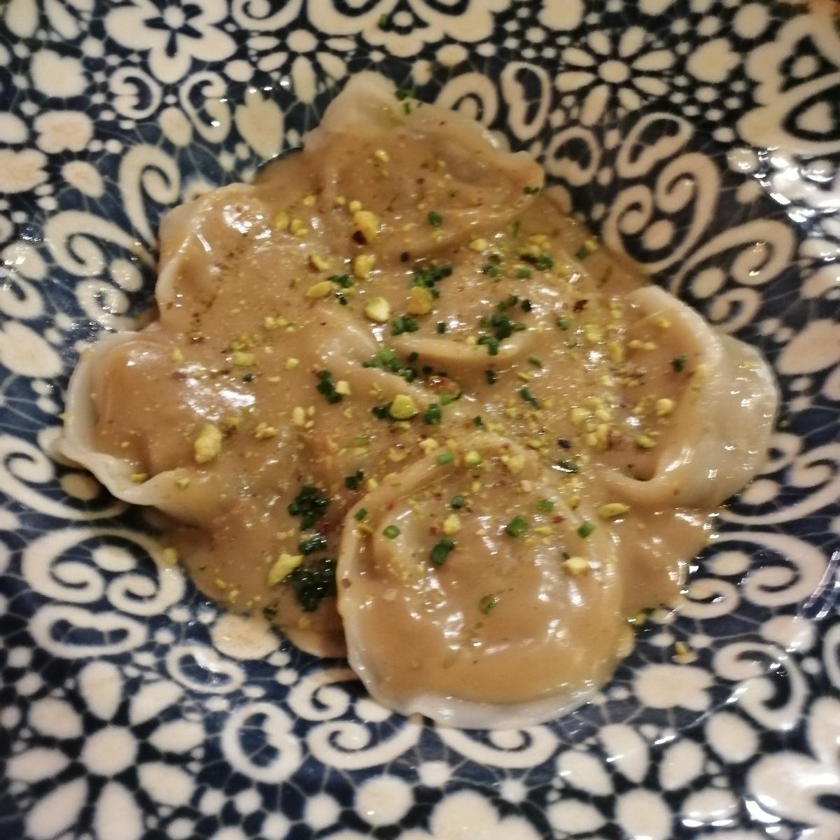 Sin duda alguna mi plato favorito de la noche. No puedo explicar lo buenísimo que estaba. Lo repetiría mil veces. Mojamos la salsa que no nos pudimos llevar con los ravioli con las patatas del cachopo jajaja