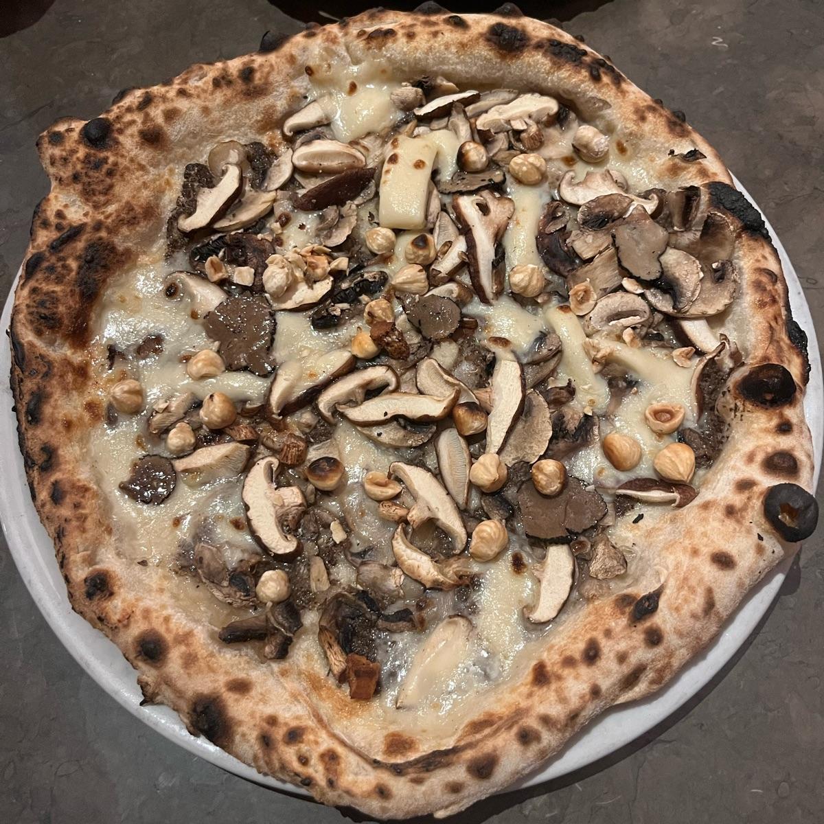Hay 3 opciones de pizza vegana. Esta tiene mozarella vegano, hongos, avellanas... muy rica.