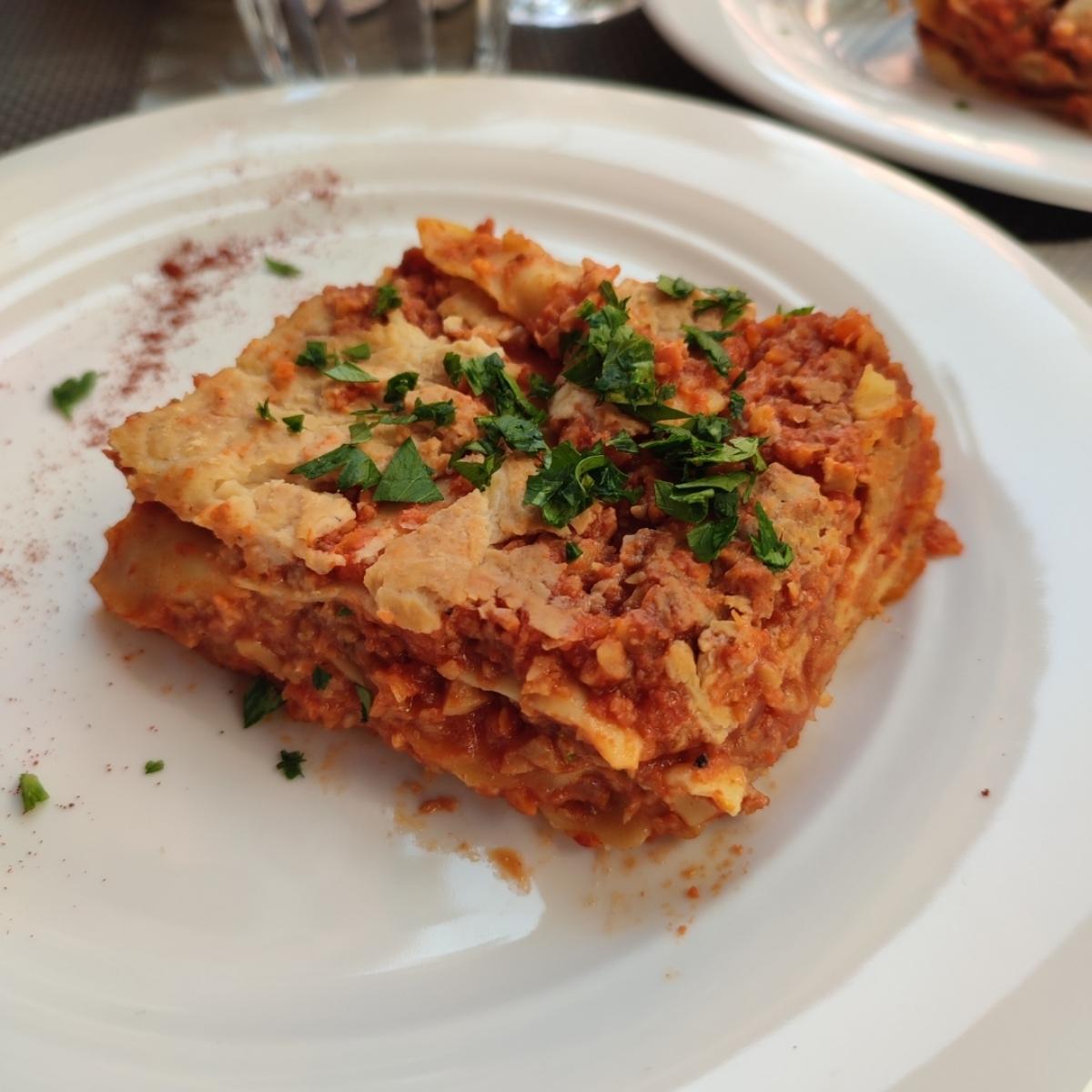 Premetto (a rischio di scomunica) che le lasagne noni sono mai veramente piaciute, se le mangio una volta all'anno poi mi posso dire a posto per gli altri 364 giorni. Quindi anche queste non mi hanno entusiasmata come genere di piatto, ma sicuramente sono tra le più buone che ho mangiato (almeno fuori casa, si sa che quelle casalinghe siano insuperabili). Il condimento è molto ricco e abbondante e rende questa lasagna umida e golosa.