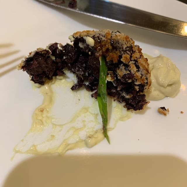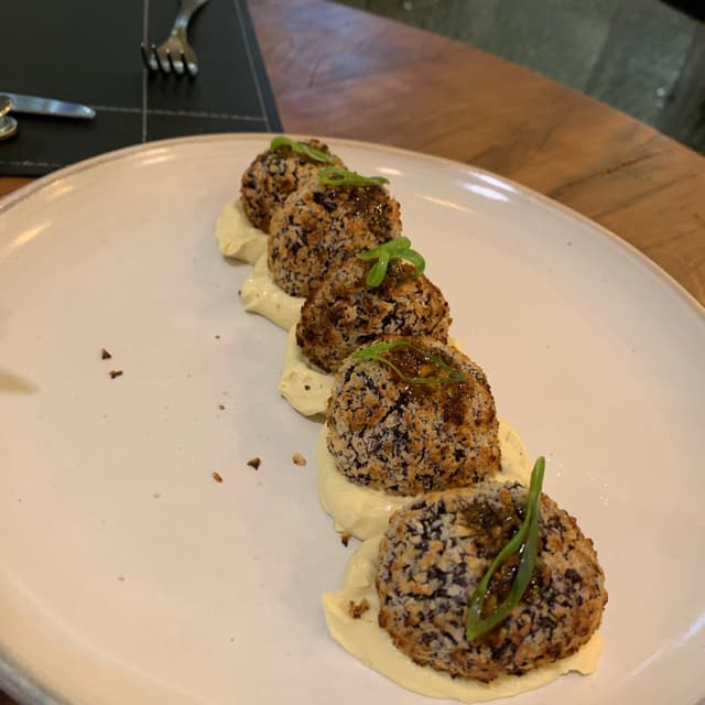 Esses bolinhos de arroz negro são uma delícia! Vem com uma maionese de missô e geléia de pimenta. O restaurante é maravilhoso e fica dentro do hotel Serra da Estrela em Campos do Jordão. E tem uma área pet friendly.
