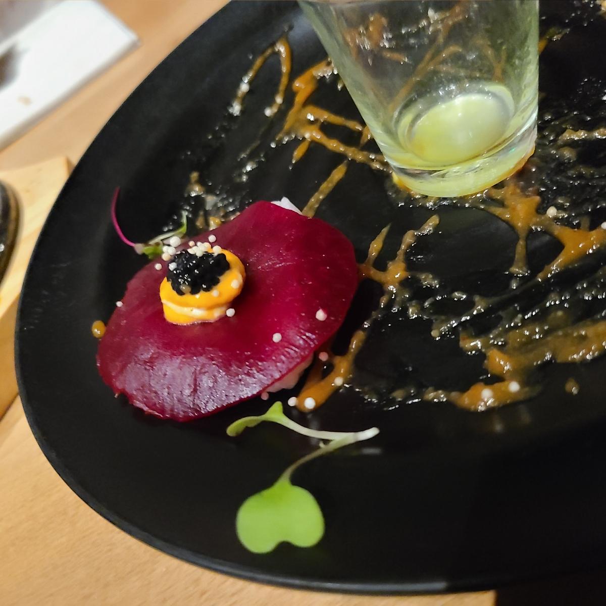 This dosh comes with five rolls covered by a thinhly sliced beet, the rolls are delicious BUT the catch is...