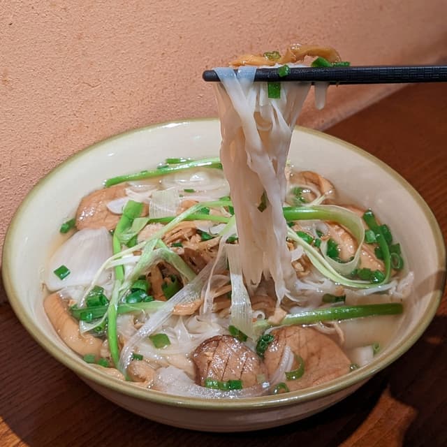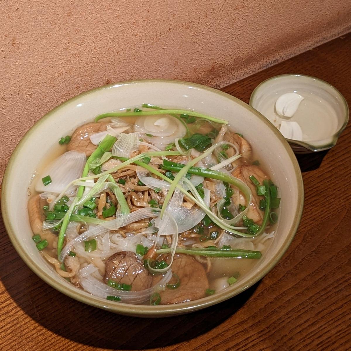 Smooth traditional rice noodles cooked with onion as well as pan-fried king oyster mushrooms scored like scallops. 🍄🍜 The soup was alright in a simple, light, and comforting way; I personally found it more flavourful after adding the garlic sauce served on the side. Would have preferred more ingredients, specifically in the protein department! Swipe ➡️ for noodle pull! (75,000 VNĐ) #vietnamese #vietnam #veganvietnamese #wholefoodplantbased #wfpb