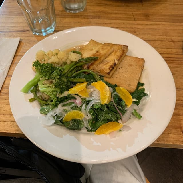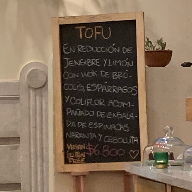 Eran 2 pedazos de tofu, con muy rico sabor, algo distinto a lo que suelo encontrar. Me gustó que parte del acompañamiento fuera ensalada y parte wok, para tener un poco de vegetales crudos y otro cocido. $ 6.800 Nov-23.