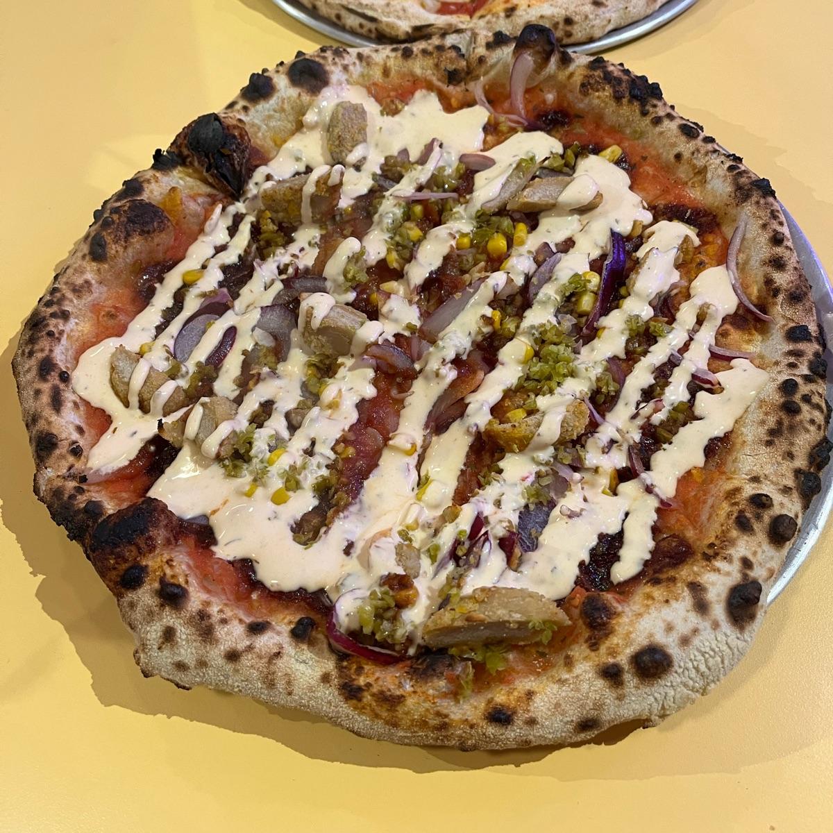 This was a great and imaginative vegan pizza - with tomato base, red onion, corn, chilli, bbq sauce, this isn’t chicken nuggets and mildly spiced vegan mayo. It all went together really well and was well cooked. My only criticism is that the vegan nuggets were a bit dry and tough. The pizza doesn’t come with vegan cheese (though you can add it if you’d like) - but it didn’t seem necessary as there’s already so many toppings and flavours and the mayo provides some creaminess.