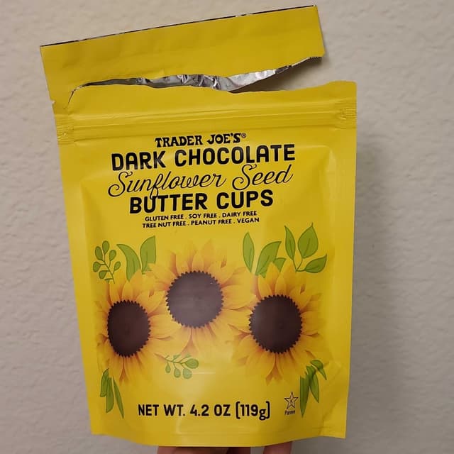 Delicious dark #chocolate sunflower butter cups. Rich chocolate and creamy center. A nut-free alternative to traditional peanut butter or almond butter cups. #traderjoes