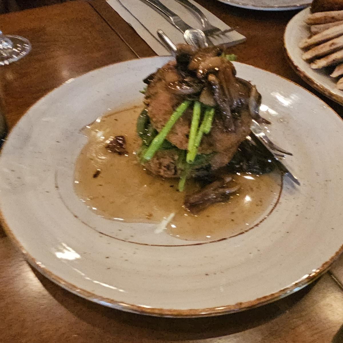 Not sure what was up with my phone camera during this dinner, but this dish was more sumptuous than this poor resolution can do justice to. A wonderful spread of flavours and textures from the asparagus+mushroom topping to the spinach and tofu combination, and the sauce was a refreshing and inspired blend of mushroom and plum which I enjoyed.