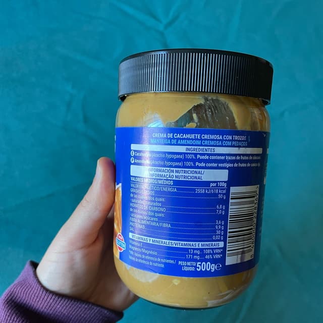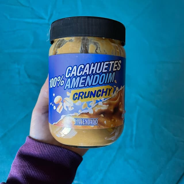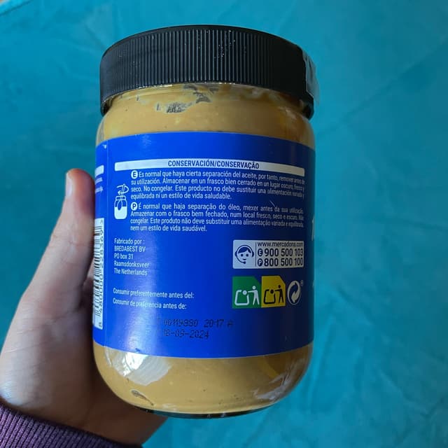 Burro d’arachidi (100%) molto buono con pezzetti croccanti dentro. Il barattolo è abbastanza grande e il prezzo è molto basso. Lo si può trovare in qualsiasi supermercato Mercadona. Il packaging è riutilizzabile essendo un barattolo. Composto da vetro e plastica. Consigliato per tutti gli amanti del burro d’arachidi
