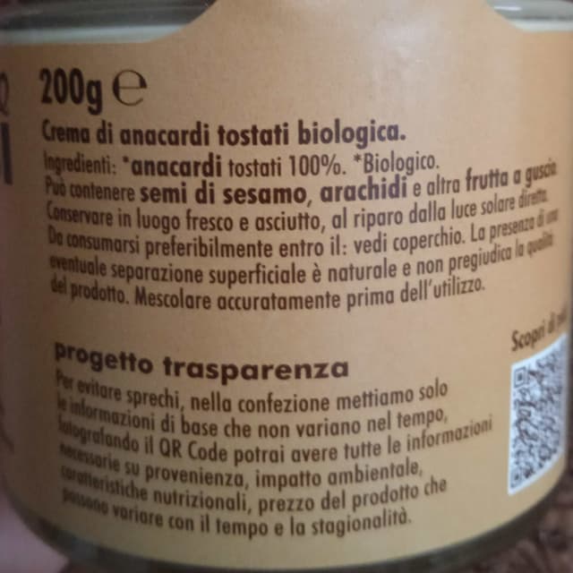 Consistenza liscia e setosa, ottima crema spalmabile di frutta secca, etichetta pulita.