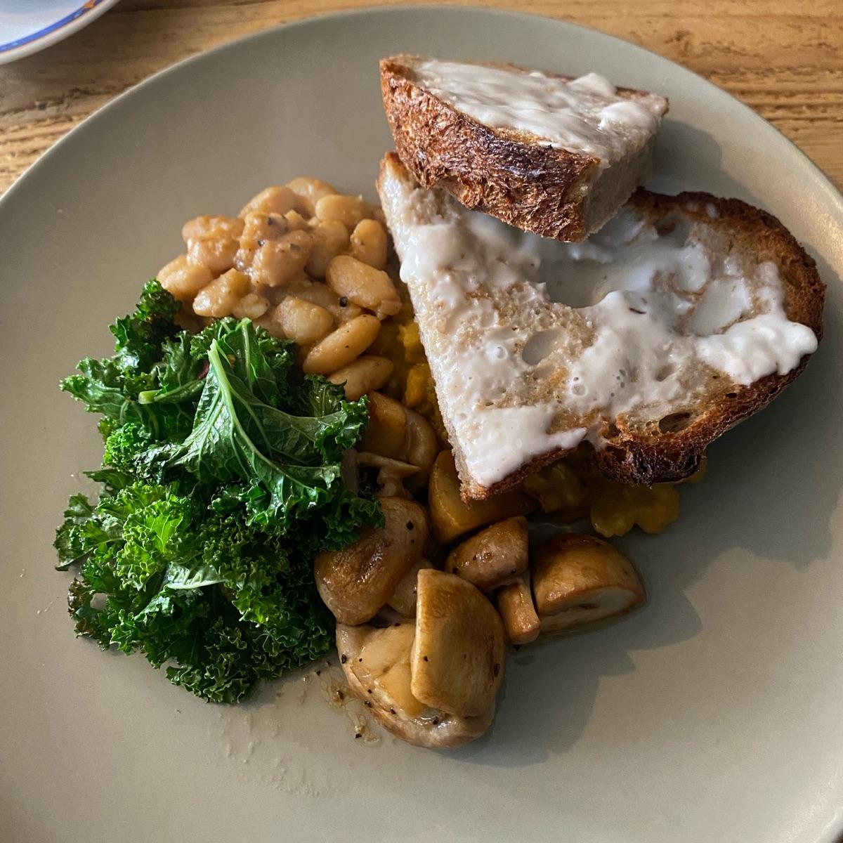 I expected a full English when I ordered this, but I’m so glad that it wasn’t one. Miso mushrooms, butterbeans, scrambled tofu and chilli and lemon kale. So good! Also, the sourdough was amazing and it was coated in a cheese spread. SO YUMMY!