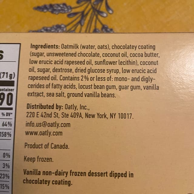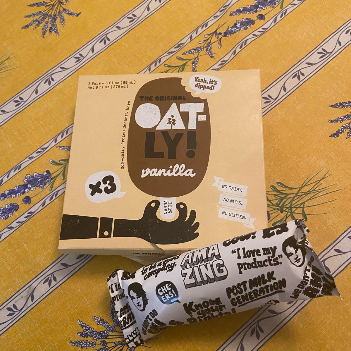 I definitely enjoyed these vanilla, chocolate dipped, oat ice cream bars from Oatly. The vanilla ice cream is so smooth and creamy. The chocolate outer coating is very nice as well. It does taste a bit like the wooden popsicle stick once you get closer to the middle. Overall a tasty vegan treat. #veganicecream