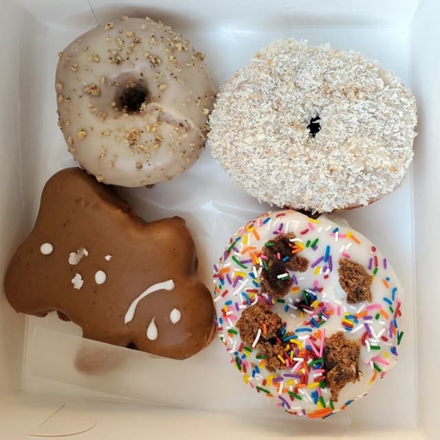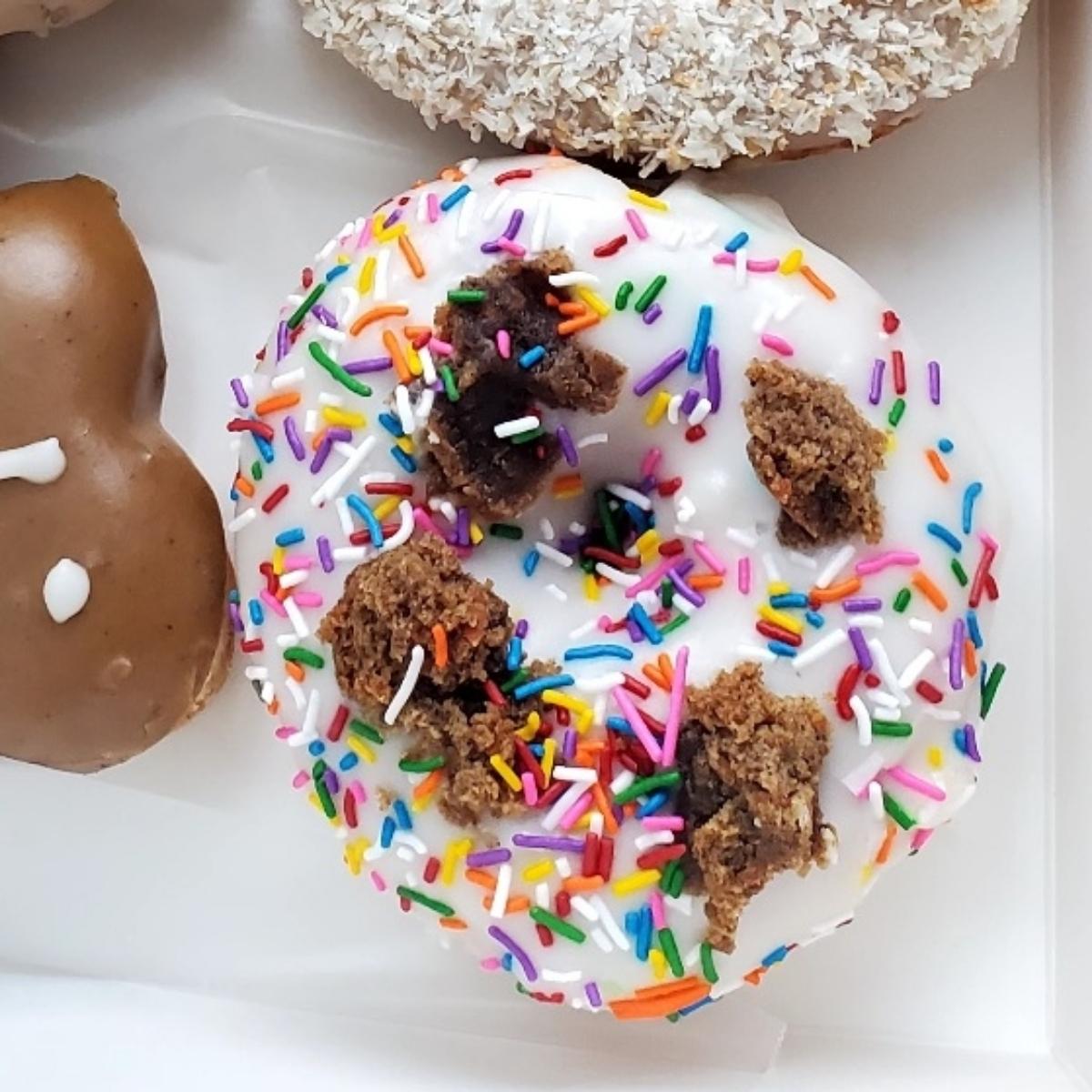 I got this one for my partner, as #birthdaycake is one of his #favourite #flavours. He loves the #vanilla with the #sprinkles whereas I don't want anything #crunchy on my #soft foods. This isn't his favourite #vegandonut though. He'd rather get the birthday cake one from #beechwood but we haven't been there in ages. #alldonutsaregooddonuts 😅