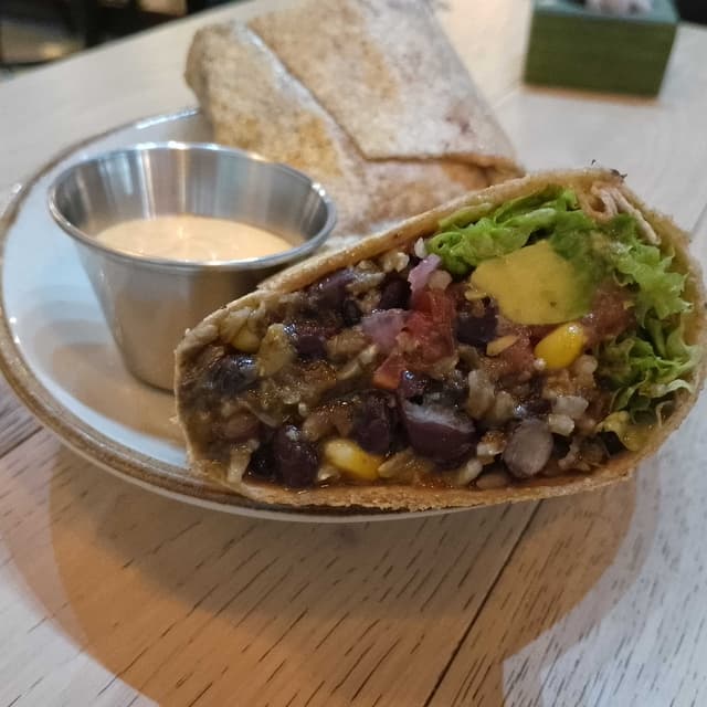 🇨🇱 🇪🇸 Porotos negros guisados, arroz integral al cilantro, palta, pico de gallo, choclo y hojas verdes. Acompañado de salsa picante.