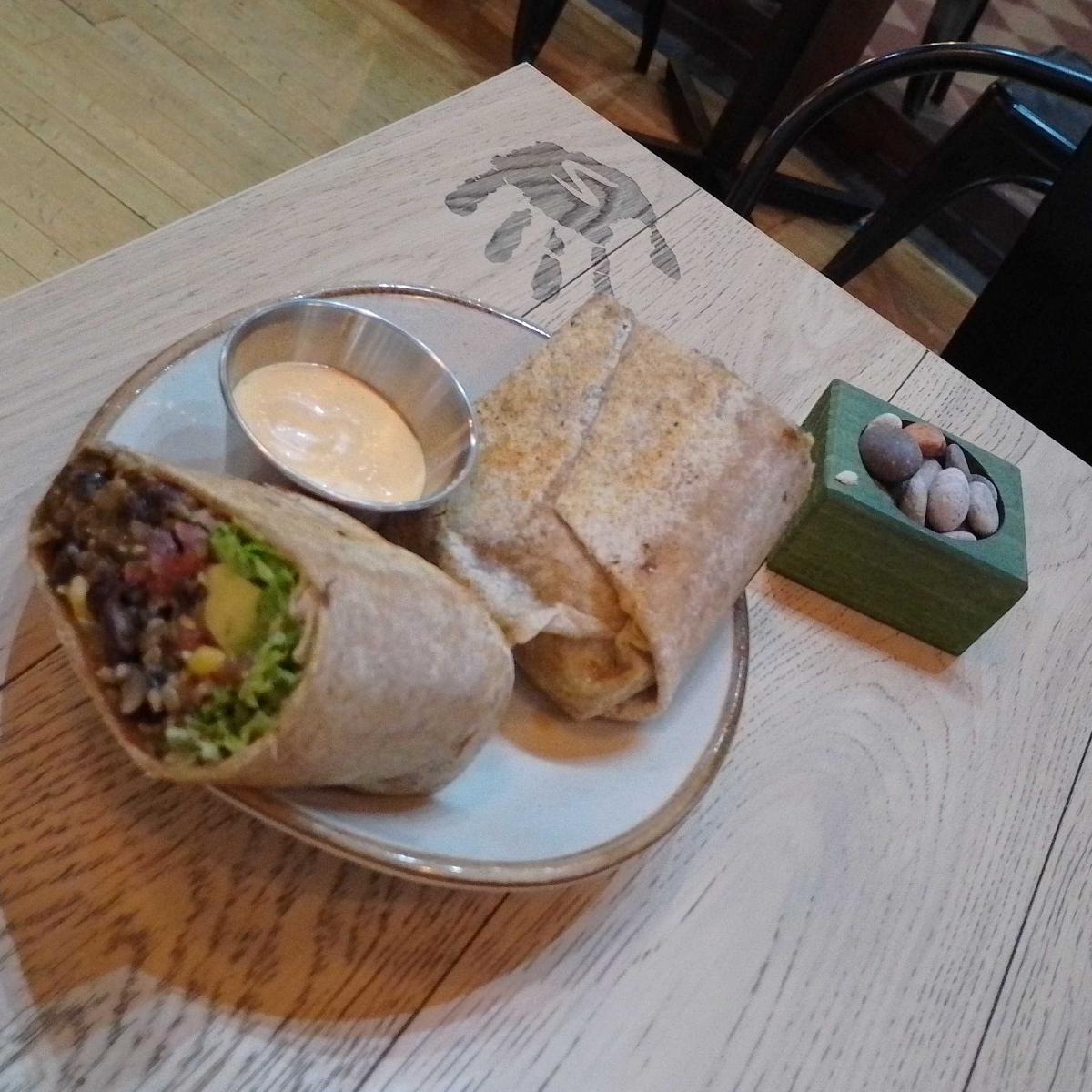 🇬🇧 🇺🇲 Black beans, brown rice, coriander / cilantro, avocado, green salad and hot sauce.