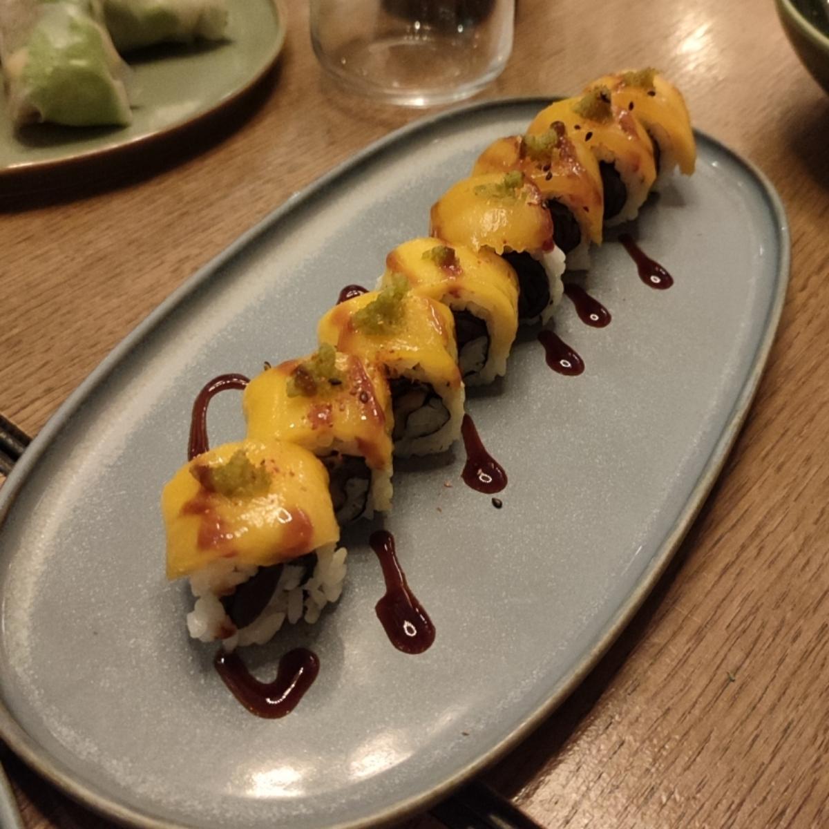 Uramaki con all'interno melanzane marinate, guarnito con carpaccio di mango, scorza di yuzu, jalapeno e salsa teriyaki. Buonissimo! È stato tra i miei preferiti.. soprattutto per la presenza del mango che metterei ovunque. La melanzana all' interno non aveva un sapore molto incisivo ma la consistenza carnosa è il suo miglior pregio, nonostante il jalapeno non era piccantissimo. Costo per 8 pezzi 14 euro.