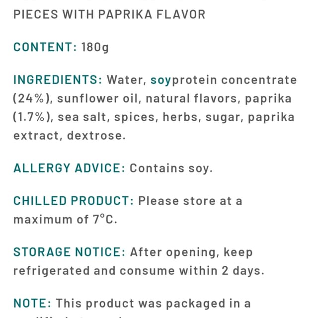 Proposto come "pollo grigliato" e... Sembra davvero pollo! È tagliato a pezzetti e come si può leggere dalla lista degli ingredienti, questi sono davvero pochi a differenza di molti altri prodotti del genere, è stato fatto un ottimo lavoro con la consistenza ma anche con il sapore, che rimane piuttosto neutro e delicato. Ottimo!