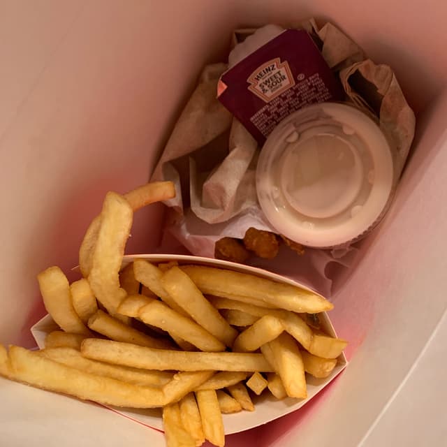 Super cute design and delicious food. The burger was really tasty, and the fries were very similar to McDonalds. Not sure about the chicken nuggets, they are almost too realistic for me. Comes with a drink and a choice of two sauces (white sauce and sweet and sour sauce are pictured here).