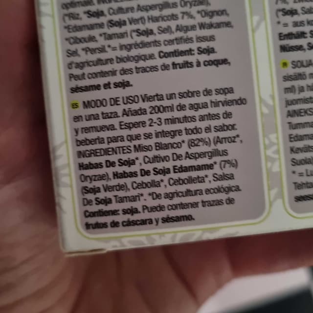 Sopa instantánea de miso con cebolla, cebolleta y salsa tamari. Se hace en pocos minutos y cada sobrecito tiene una buena cantidad para una sopa abundante. Si cueces unos noodles y los echas a la sopa te haces un ramen en un plis.