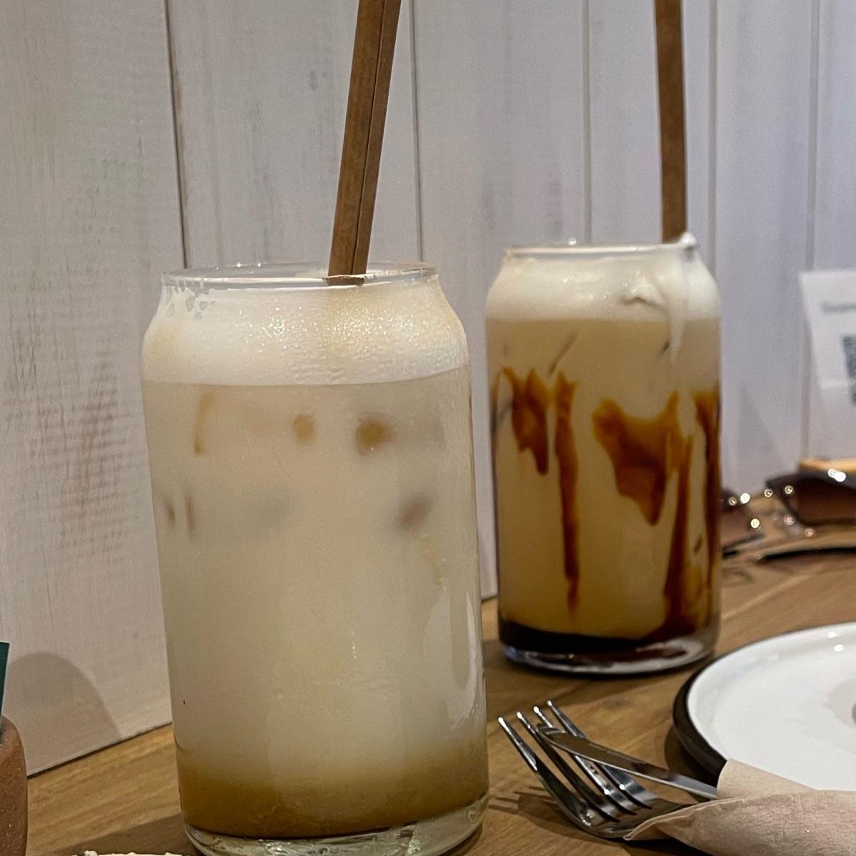 izquierda: iced latte. derecha: iced caramel latte. ambos muy ricos. al caramel se le queda todo el caramelo en el fondo which sucks porque la pajita se desarma si la usas para revolver con esmero