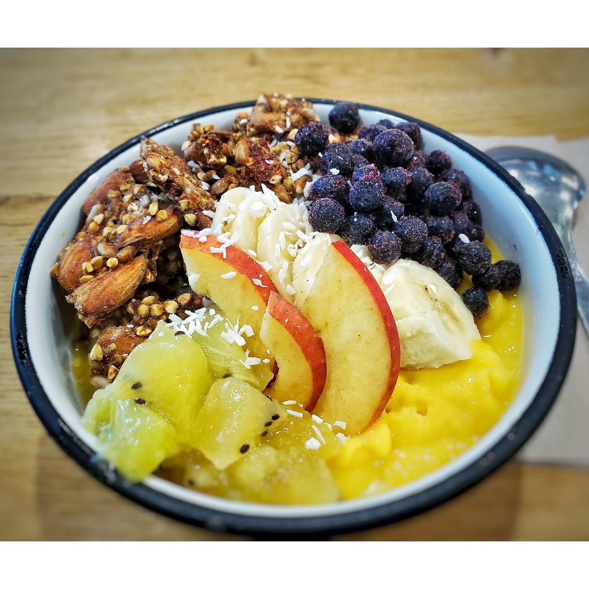 While I don't generally love frozen fruit 🥶, I enjoyed this bowl; it was flavorful and the (very tasty) granola made it decently filling. The base is pureed frozen mango.