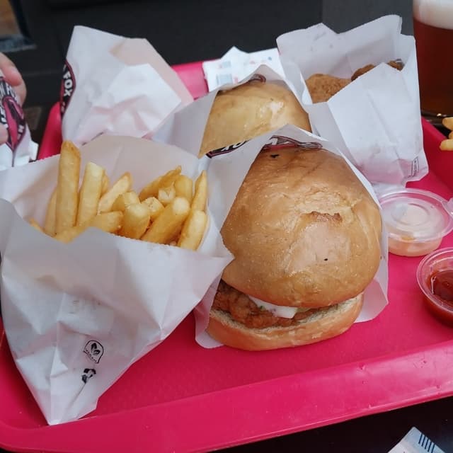 Me gusto bastante. No me convencía porque no me suele gustar mucho las hamburguesas de pollo, ni siquiera más especistas pero estaba rica. El combo viene con papas y una gaseosa, podes pedir agua o cerveza