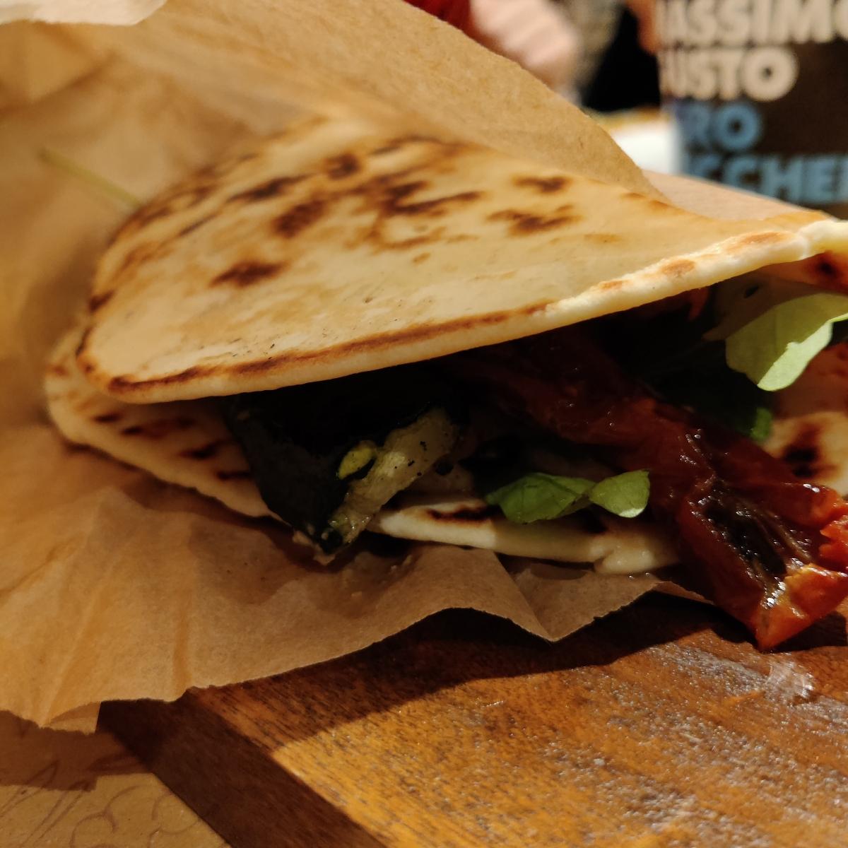 Nuova proposta 100% vegana del locale. La piada è farcita con hummus di ceci, zucchine grigliate, pomodorini secchi e noci.