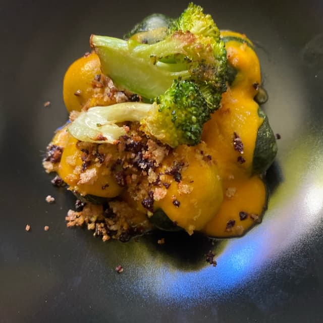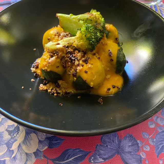 Primo: gnudi agli spinaci con crema di zucca e sbriciolata di pane e olive, anche questi piatto molto buoni ma dal sapore non decisissimo degli gnudi che si sono un po’ persi nel condimento.