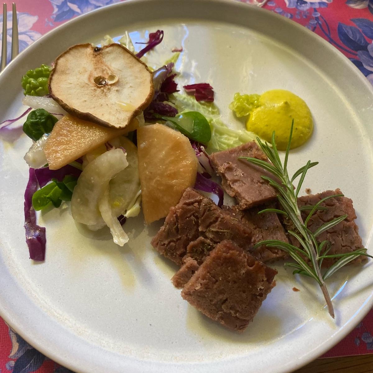 Ieri abbiamo avuto il piacere di prendere parte ad un gustosissimo pranzo vegano nei pressi di Pavia! Al ristorante La Cena di Pitagora si è immersi nel verde delle colline pavesi. All’interno il locale è allestito in modo semplice ma accogliente. Il menù è fisso e comprende antipasto, primo, secondo e dolce. Qui nelle foto l’antipasto a base di torta salata di castagne e misticanza: mi è piaciuto moltissimo, il simil-castagnaccio era davvero buonissimo, molto saporito e alleggerito dall’insalata che era ben curata.