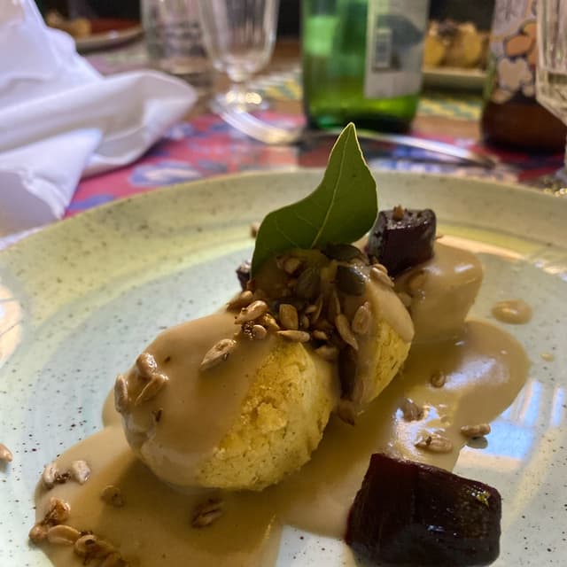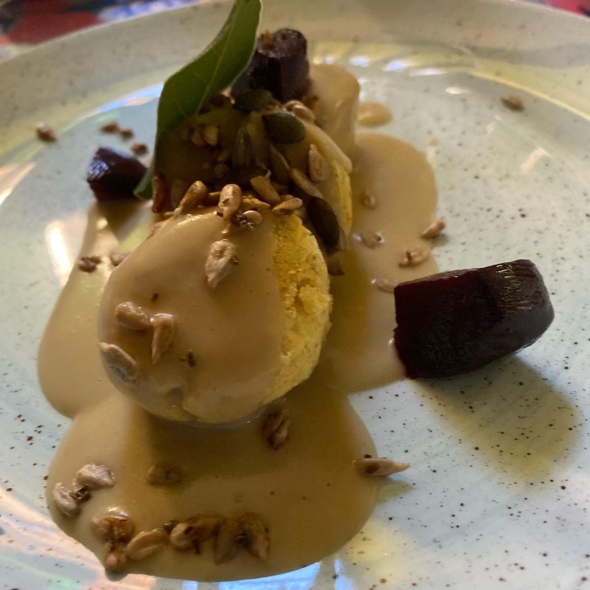Rotolo ai legumi con salsa di ceci, rape rosse e semi di zucca. Buono: la salsa super liscia e cremosa, il rotolo un pochino anonimo ma non male.