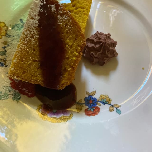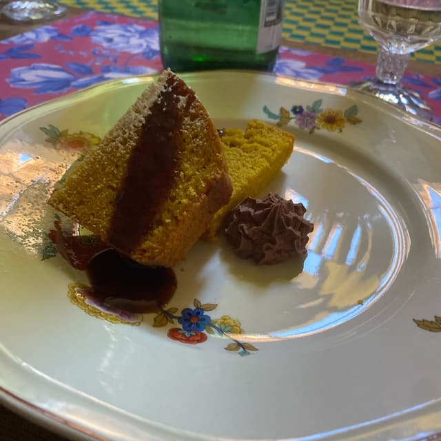 Il dolce: una plum-cake di zucca con mousse al cioccolato e marmellata di frutti rossi. Sapore approvato ma un po’ secco, è forse un dolce più da colazione.