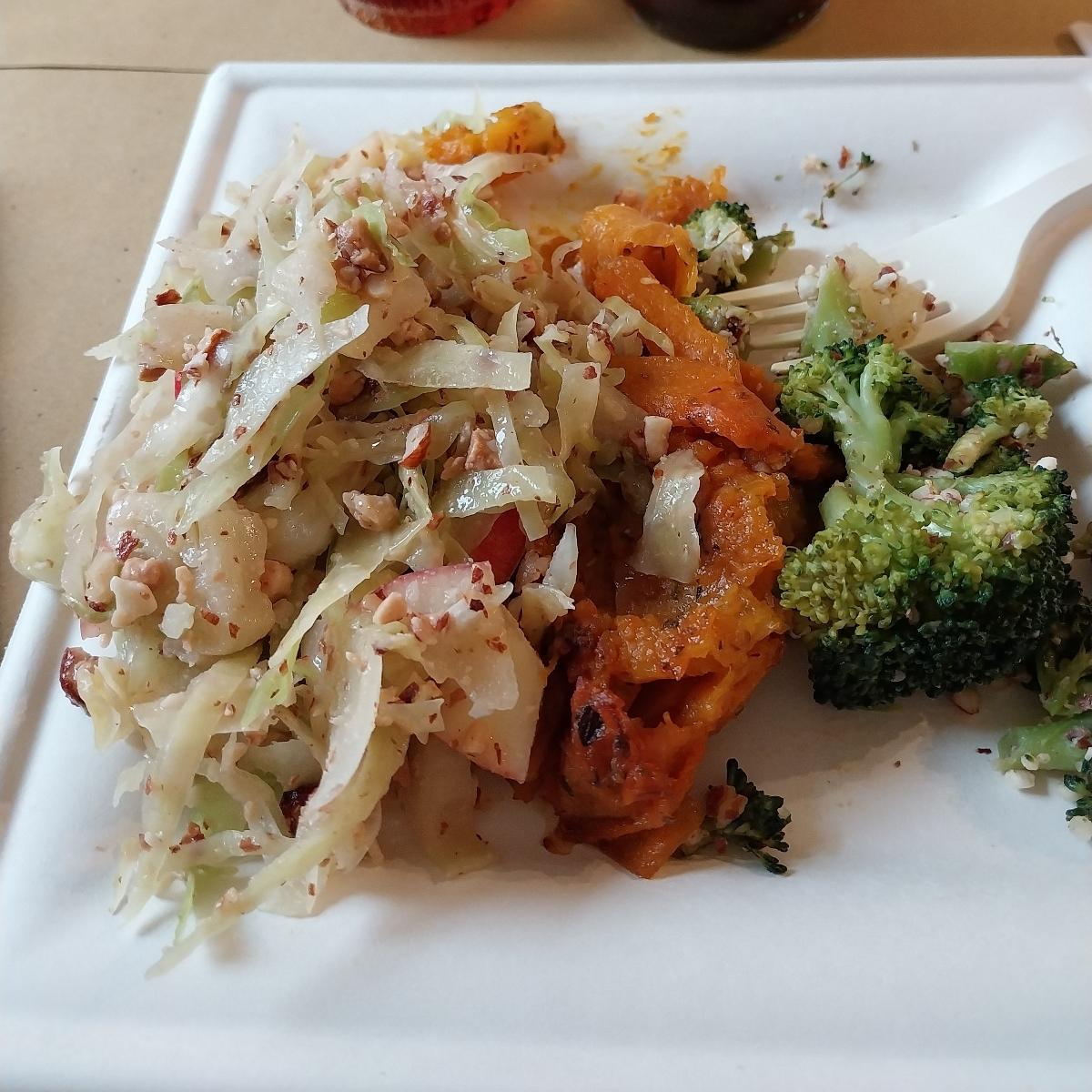 Puoi comporre il piatto misto come più ti piace.Io ho scelto broccoli, zucca al forno e insalata mista di cavolo cappuccio, mela e semi misti.