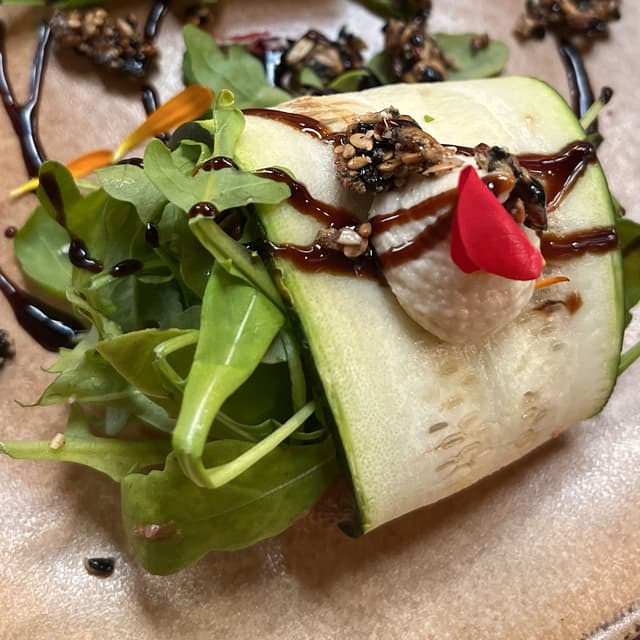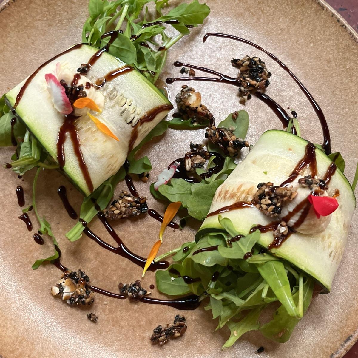 Entrante para compartir y picar, liguero, fresco, explosión de sabores compuesto por dos unidades de calabacín crudo enrollado con pesto de limón y remolacha, crema de queso de anacardo, granola multisemillas crujientes, crema balsámica, rúcula y tomate deshidratado.