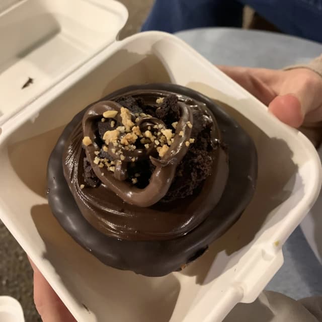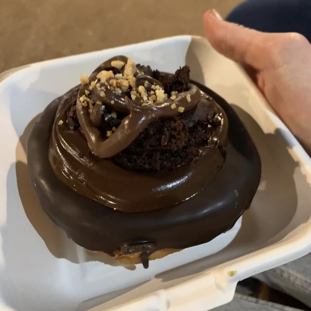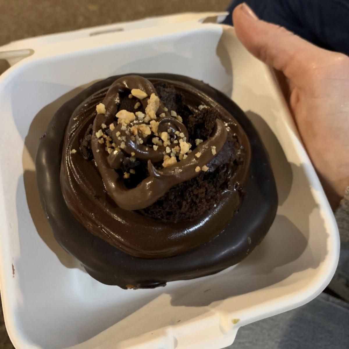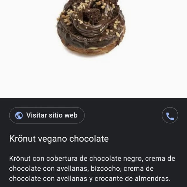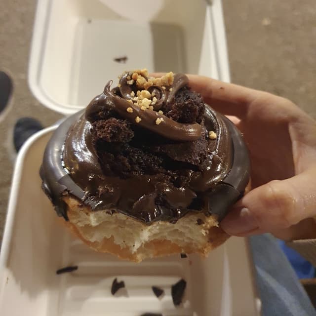 Es un krönut (mezcla de croissant y donut) con covertura de chocolate negro, crema de chocolate con avellanas, bizcocho, crema de chocolate con avellanas y crocante de almendras.