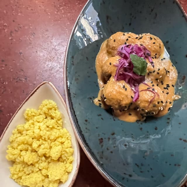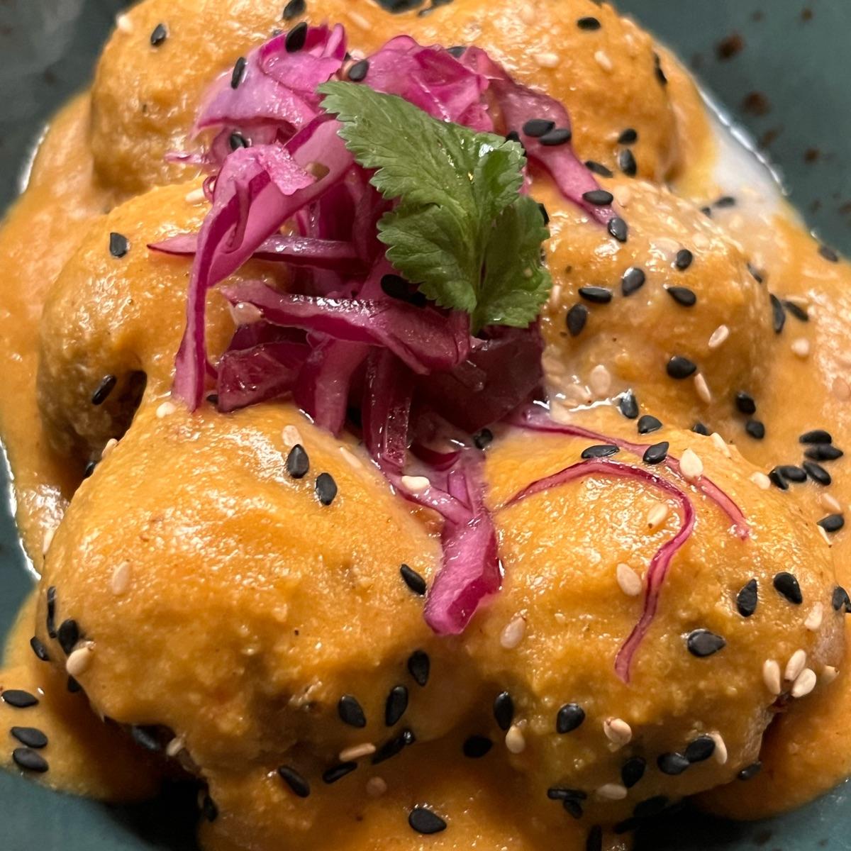 6 albóndigas de judía roja, avena y arroz con salsa de curry echa a base de especias garam masala, anacardo, crema de coco y sofrito de ajo, jengibre y tomate. Acompañado de cuscús.