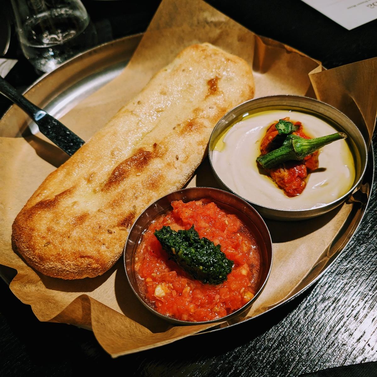 The #focaccia #bread was crusty outside and soft inside, an excellent combination 🙂 Instead of aubergine and goats cheese they gave us something reddish that @m1tch9i really liked. I on the other hand preferred the #okra that was stuck inside the most sophisticated, lush, and delicious #tahini that I have ever had in my life 😋 There was enough volume on this plate to fill all 3 of us up, too - prices are high but you get what you pay for! 😉