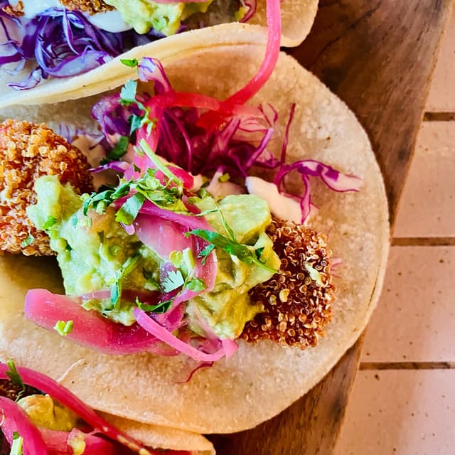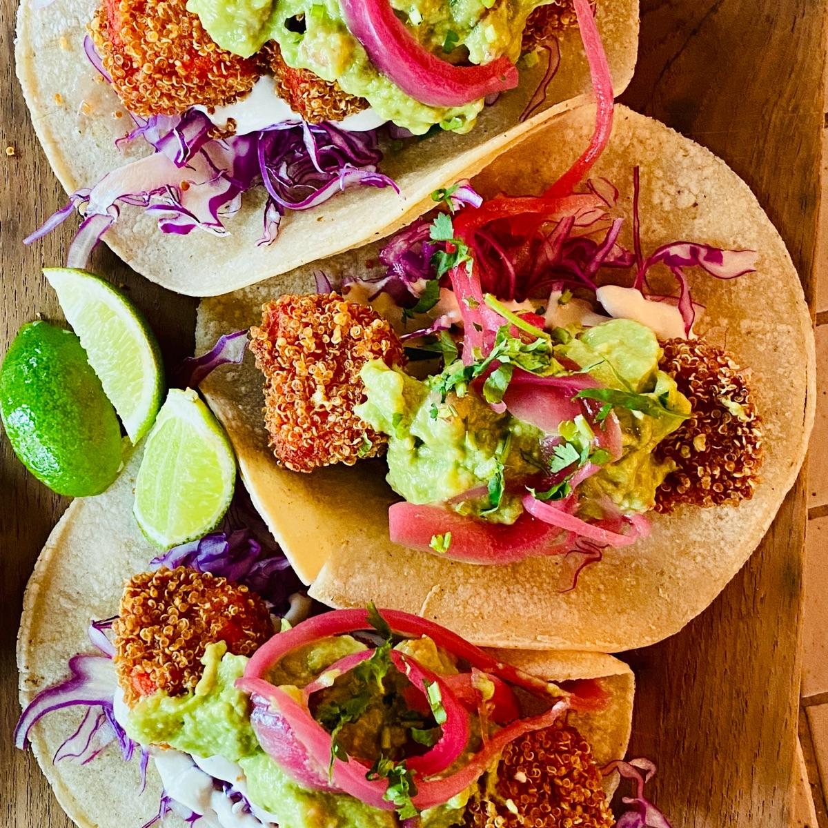 I love everything about these amazing quinoa crusted fried tofu tacos except the price! At $9 a taco they’re definitely a treat but kudos to Super Loco for taking feedback from the abillion community and adding tons of vegan options in the last year. Thank you Super Loco!