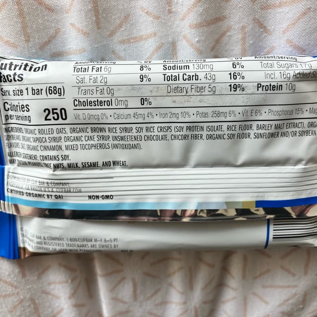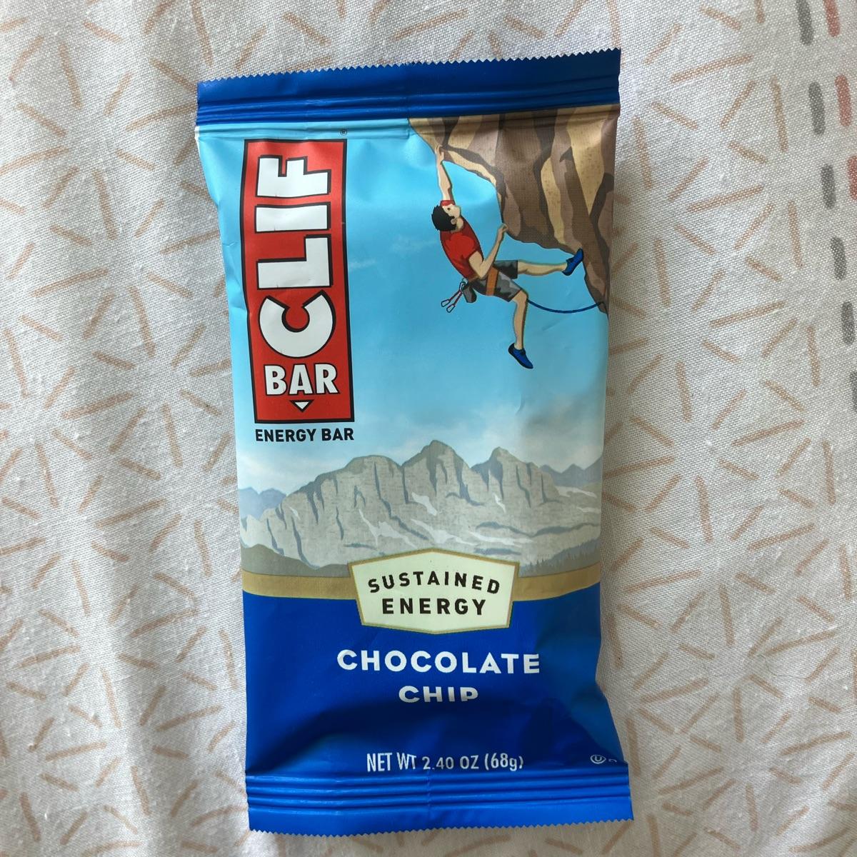 Photo 1: Plastic packaging that says “Clif Energy Bar Chocolate Chip: Sustained Energy” with an illustration of a man rock climbing.