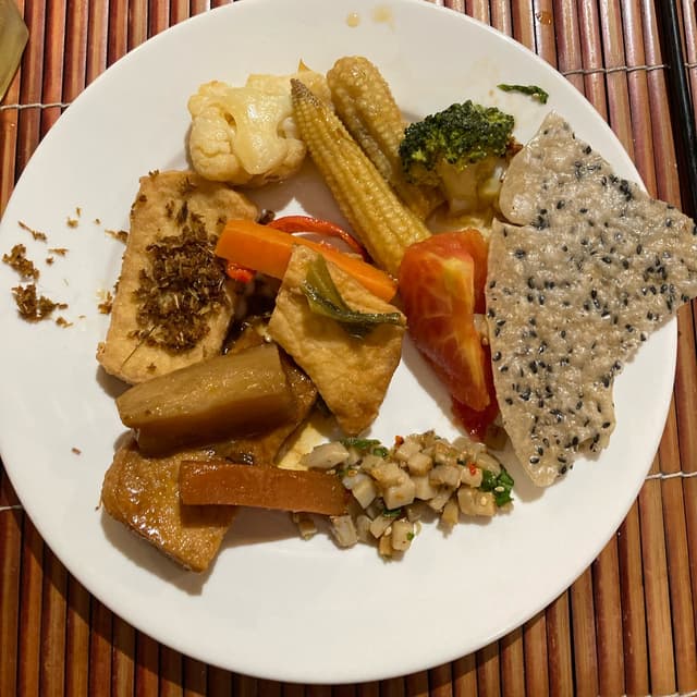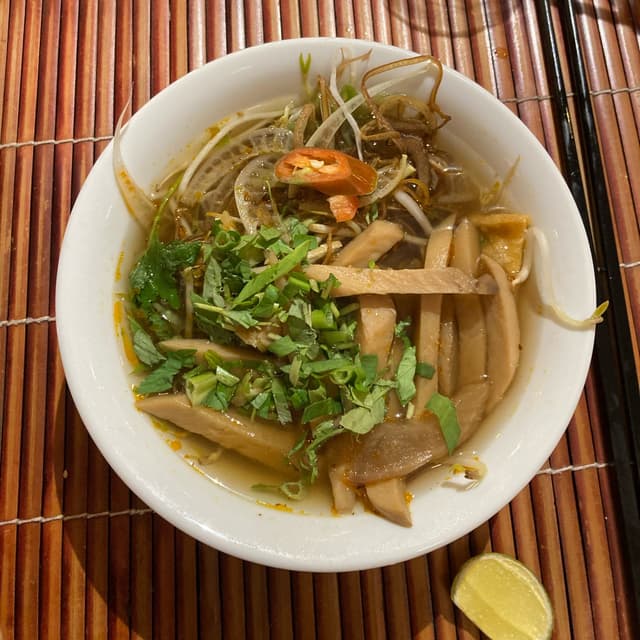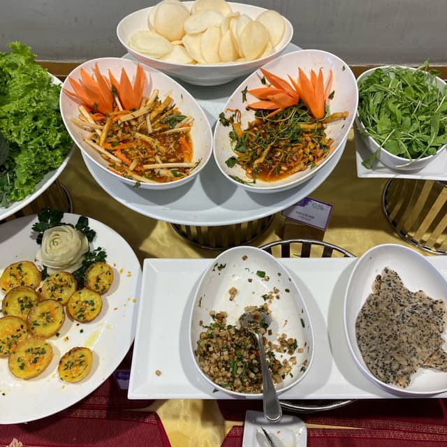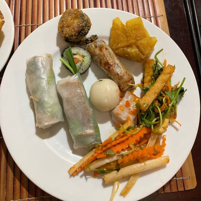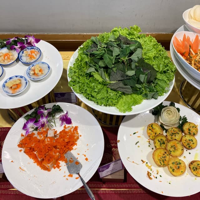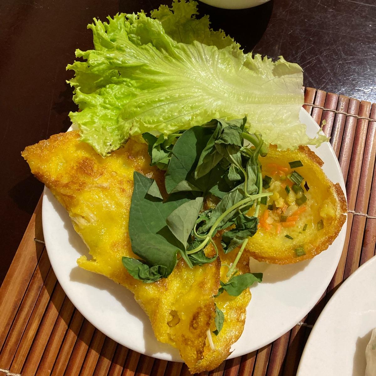 Possibly the best vegetarian buffet I’ve ever been to - and I’ve been to quite a number! It’s located inside a hotel, so it might be a bit harder to find. Just follow the signs and then take the elevator to the seventh floor. Staff will seat you immediately and you’re good to go: all you can eat buffet awaits you. Classic #vietnamese dishes are made vegetarian and vegan: banh xeo was a highlight. There is one table with starters such as fresh and flavorful salads, fried starters, other dishes such as sushi, and more. Then there’s the section with warm dishes, ranging from curries to stir fries and more - there’s even a soup station to make yourself a fresh and boiling soup. Variety seems endless. The price also includes classic Vietnamese desserts and fruit, as well as water, coffee and tea. Divine! Staff is quick to clean your plates when finished, and they’re super friendly and helpful - one guy showed me how to make the soup, while another introduced me to the dessert section or helped me to mix a nice sauce for my starters. Incredible experience for ~240k as of December 2023