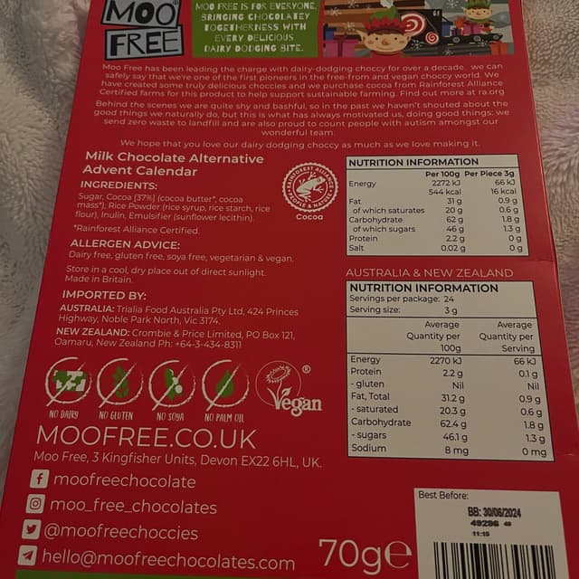 🍫🎄 I was very fortunate to be gifted this by my secret Santa 🎅at work. How kind of Santa 🤶to get me a vegan advent 🗓️calendar!?! Soooo lucky. These are about £5 in the shops here. While I haven’t liked the Moo Free chocolates in the past, this does the trick and feels very🎁 festive. It’s not organic sadly but it’s cheap and cheerful. It is rainforest alliance certified though. #ditchdairy #veganadventcalendar #chocoholic #chocolate #veganchocolate #glutenfree #rainforestalliance #rainforestalliancecertified