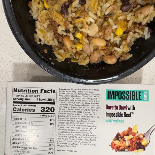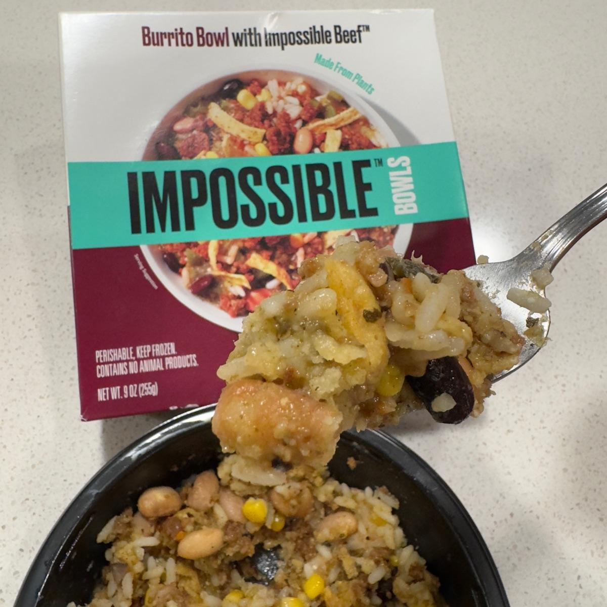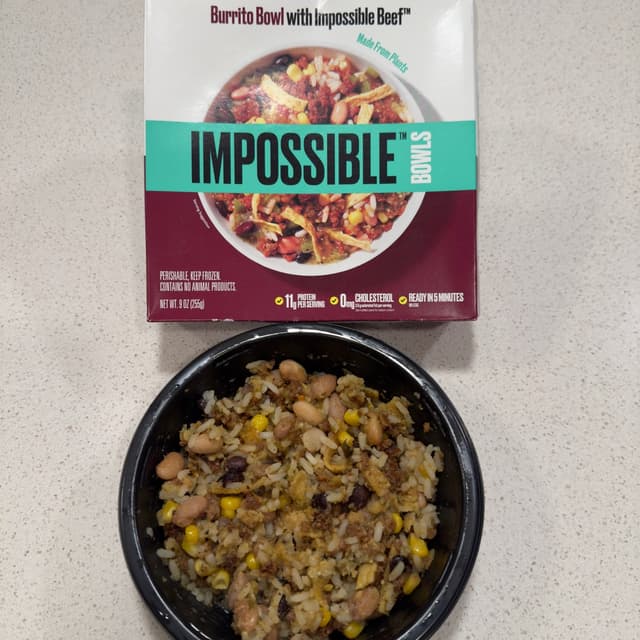 Hubby and I loved everything about this Burrito Bowl with Impossible Beef!! Beans, plant based beef, rice 🍚 , corn 🌽 in salsa verde with tortilla strips!! Yum yum 😋!! The tortilla strips did get soft after heating but it gave the bowl an extra bit of texture and flavor that went well with all the other ingredients! Another amazing bowl by Impossible Foods! Perfect quick #lazyvegan meal! Will most definitely get this one again!