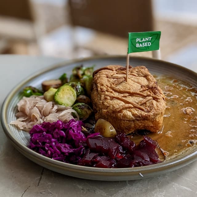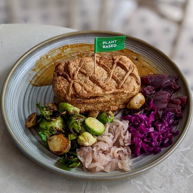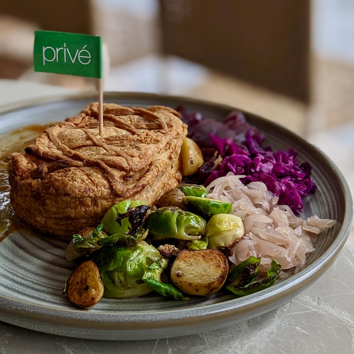 Vegan short crust pastry filled with #Impossible meat and chestnut-lentil stuffing. 🥧🌰 I was pleasantly surprised and impressed by how fragrant and 'buttery' the pastry was despite looking slightly dry! The filling was very 'meaty' indeed haha, swipe ➡️ for a picture of the cross-section! Personally would have preferred a higher chestnut-lentil stuffing to 'meat' ratio, as the former was more multidimensional and I'm always a fan of whole foods~ Served alongside roasted baby potatoes and Brussels sprouts (unfortunately quite greasy in my opinion), red onion confit, purple cabbage sauerkraut (mainly salty rather than sour), cranberry jam (semi-solid), and gravy. 🥔🧅🍒 Overall a unique vegan Western dish we don't often find in Singapore. Christmas 2023 special available at all Privé outlets till 31st Dec 2023! 🎄 (Contains alliums, $23; $25 at Botanic Gardens outlet) #sgvegan #veganoptions #christmas #veganchristmas